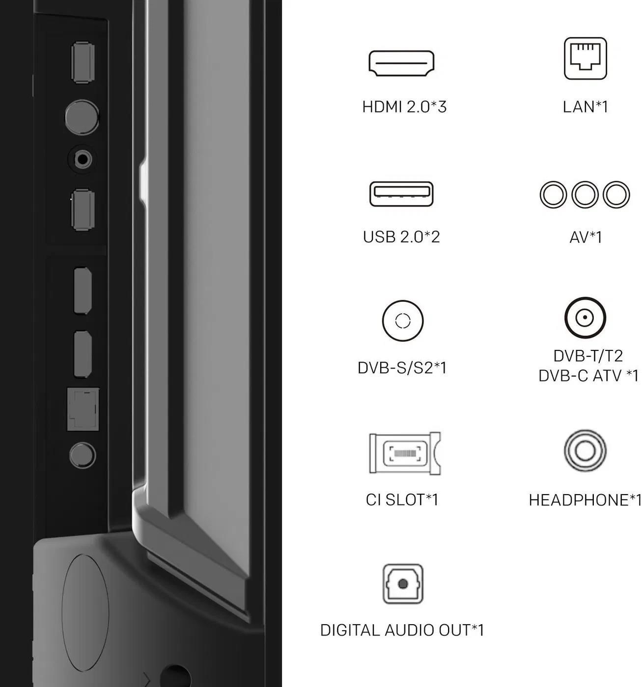 Google TV, LED, 165cm, 4K Ultra HD, 50/60 Hz, HDR10, DVB-T2/S2/C, 3× HDMI, 2× USB, CI+, USB nahrávání, LAN, Bluetooth, Chromecast, Miracast, herní režim, hlasové ovládaní, Google Assistant, párování s mobilním zařízením, Oneplay, VESA 400×200, DTS Studio Sound, energetická třída F. Evropská distribuce..