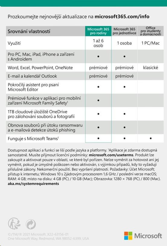 Klíčové vlastnosti služby Microsoft 365 pro rodiny (elektronická licence)