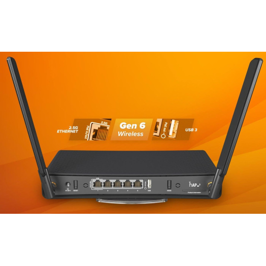 Popis produktu Router do domácností či malých firem s označením hAP ax3 případně C53UiG+5HPaxD2HPaxD má L6 licenci, desktop provedení a obsahuje 5 Gigabitových portů z nichž 1. port podporuje PoE in i PoE out a dokonce i 2.5Gigabit ethernet. Kromě toho má router dvě rádiové části s podporou 802.11a/b/g/n/ac/ax standardů umožňující současný provoz v obou pásmech a dvě odnímatelné všesměrové antény. V pásmu 2,4 GHz je podporováno 2×2 MIMO s přenosovou rychlostí až 574 Mbps a v pásmu 5 GHz 2×2 MIMO s přenosovou rychlostí 1200 Mbps. Zisk dvou odnímatelných bezdrátových antén je 3.3 dBi (2.4 GHz) a 5.5 dBi (5 GHz).    Klíčové vlastnosti (1) 2.5 Gigabit ethernet + (4) Gigabit ethernet Podpora PoE in/out na 1. portu 1800 MHz CPU - 4 jádra, ARM 64bit achritektura 128MB NAND, 1GB RAM Wi-Fi - 2,4 GHz (2×2 MIMO, 574 Mbps, 802.11ax), 5 GHz (2×2 MIMO, 1200 Mbps, 802.11ax) Podpora WPA3 šifrování RouterOS level 6 (2) odnímatelné antény, 5.5 dBi zisk Standard 802.11ax zvyšuje rychlost až o 40 % v pásmu 5 GHz a až o 90 % v pásmu 2,4 GHz Obsah balení Zařízení (2) Anténa Napájecí adaptér 24 V/1,5 A Plastový stojánek + šroubky    Technické parametry Bezdrátové vlastnosti Bezdrátové frekvence:2.4 + 5 GHz (dual band) WiFi standardy:802.11ac, 802.11ax, 802.11n, 802.11a, 802.11b/g MU-MIMO:Ano Přenosová rychlost - 5GHz [Mb/s]:1200 Přenosová rychlost - 2.4GHz [Mb/s]:574 Vysílací výkon 2.4GHz [dBm]:27 Vysílací výkon 5GHz [dBm]:28 Šifrování:WPA, WPA2, WPA3 2.4GHz MIMO:2 x 2 5GHz MIMO:2 x 2 Typ antény:Odnímatelná Počet odnímatelných antén:2 Zisk antény [dBi]:3,3, 5,5 Konektory a rozhraní Počet portů USB 3.0:1 VF konektory:(2) RSMA female Rychlost LAN:(1) 1G/2.5Gbps + (4) 10/100/1000Mbps Gigabit LAN:Ano USB:Ano Napájení Napájení přes PoE:18 .. 28V DC Typy PoE:PoE-Out + PoE-In Počet PoE Out portů:1 PoE budget [W]:15 Max. spotřeba energie [W]:15 Napájení přes konektor/svorkovnici:12 .. 28V DC Fyzické charakteristiky Provedení:Desktop Použití:Vnitřní Provozní teplota [°C]:-40 až 70 Šířka [mm]:251 Výška [mm]:39 Hloubka [mm]:130 Hardware CPU:IPQ-6010 Frekvence CPU [MHz]:1800 Počet CPU jader:4 Interní uložiště [MB]:128 RAM [MB]:1024 Software Operační mód:AP Router Operační systém:RouterOS - L6 Podpora IPv6:Ano Výchozí IP adresa:192.168.88.1 Výchozí jméno a heslo:admin / -.