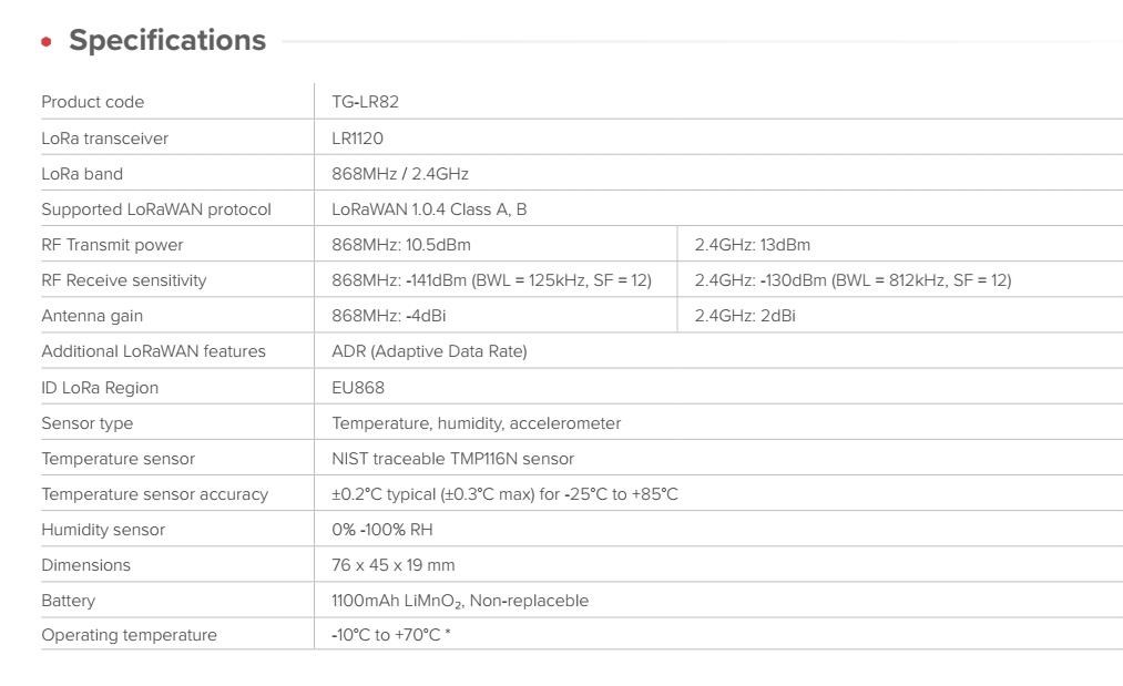 Konfigurovatelný senzorový tag LoRaWAN TG-LR82 je flexibilní a cenově výhodný nástroj pro sběr dat pro přijímání operačních rozhodnutí. Sledujte teplotu, vlhkost, pohyb a události pomocí konfigurovatelného senzorového tagu LoRaWAN, který je navržen pro nasazení v oblastech IoT. TG-LR82 kombinuje několik senzorů, inteligentní pravidla pro zpracování událostí a flexibilní profily reportování v jednom kompaktním zařízení. Toto usnadňuje monitorování prostředí, zařízení a logistiky na velké vzdálenosti. Je navržen pro bezproblémovou spolupráci s bránami MikroTik LR8 a dalšími moderními monitorovacími platformami. TG-LR82 kombinuje snímání okolního prostředí a pohybu s integrovaným zpracováním dat. Díky vysoce přesnému měření teploty je TG-LR82 obzvláště vhodný pro monitorování teplotně citlivého zboží a prostředí. Zařízení dokáže před odesláním telemetrických dat vypočítat průměrné hodnoty teploty a vlhkosti nebo vytvořit histogramy. Tím se snižuje zatížení sítě, přičemž zůstávají zachovány cenné informace o podmínkách v okolí. Automatizace: když se podmínky změní, senzor reaguje TG-LR82 podporuje více konfiguračních profilů a pravidel založených na událostech, což umožňuje zařízení automaticky se přizpůsobovat měnícím se podmínkám. To umožňuje výkonné monitorovací scénáře bez složité backendové logiky. TG-LR82 podporuje flexibilní konfiguraci prostřednictvím downlinků LoRaWAN. Generujte datové pakety pomocí specializovaného konfiguračního nástroje nebo integrujte s platformami, jako je The Things Network (TTN). Flexibilita v pásmu 2,4 GHz pro LoRa! TG-LR82 podporuje také 2,4 GHz LoRa, což umožňuje nasazení bez regionálních omezení frekvencí. Na rozdíl od sub-GHz pásem LoRa, která se liší podle regionu, lze 2,4 GHz LoRa používat globálně bez přepínání frekvencí. Typický dosah může dosáhnout přibližně 1,5 km, v závislosti na anténě brány a prostředí. Díky tomu je to praktická volba pro pohyblivá prostředí, jako jsou kontejnerové lodě nebo mezinárodní logistické systémy. Stejný princip lze uplatnit i v dalších monitorovacích scénářích: Při sledování prahových hodnot teploty nebo vlhkosti, detekci nárazu či volného pádu, monitorování polohy nebo náklonu, sledování aktivity zařízení a majetku a podobně. Integrovaný magnetický jazýčkový spínač umožňuje detekci otevření dveří či víka a umožňuje jednoduchou interakci se zařízením pomocí magnetu. Od chladírenských řetězců po skladovací prostory, od logistiky po environmentální výzkum – TG-LR82 se hodí pro celou řadu aplikací. Kompatibilita s monitorovacím systémem Data ze senzorů zařízení TG-LR82 lze vizualizovat a analyzovat pomocí moderních monitorovacích platforem, jako je Grafana. Díky podpoře kontejnerů v systému MikroTik RouterOS lze dashboardy Grafany rychle nasadit, což umožňuje vizualizaci telemetrických dat v reálném čase i analýzu historických údajů. Mezi příklady telemetrických údajů patří: • Vývoj teploty a vlhkosti • Stav orientace a aktivity • Histogramy okolního prostředí • Stav baterie a síla signálu Technické specifikace: Product code: TG-LR82 LoRa transceiver: LR1120 LoRa band: 868MHz / 2.4GHz Supported LoRaWAN protocol: LoRaWAN 1.0.4 Class A, B RF Transmit power: 868MHz: 10.5dBm 2.4GHz: 13dBm RF Receive sensitivity: 868MHz: -141dBm (BWL = 125kHz, SF = 12) 2.4GHz: -130dBm (BWL = 812kHz, SF = 12) Antenna gain: 868MHz: -4dBi 2.4GHz: 2dBi Additional LoRaWAN features: ADR (Adaptive Data Rate) ID LoRa Region: EU868 Sensor type: Temperature, humidity, accelerometer Temperature sensor: NIST traceable TMP116N sensor Temperature sensor accuracy: ±0.2°C typical (±0.3°C max) for -25°C to +85°C Humidity sensor: 0% -100% RH Dimensions: 76 x 45 x 19 mm Battery: 1100mAh LiMnO2, Non-replaceble Operating temperature: -10°C to +70°C *.