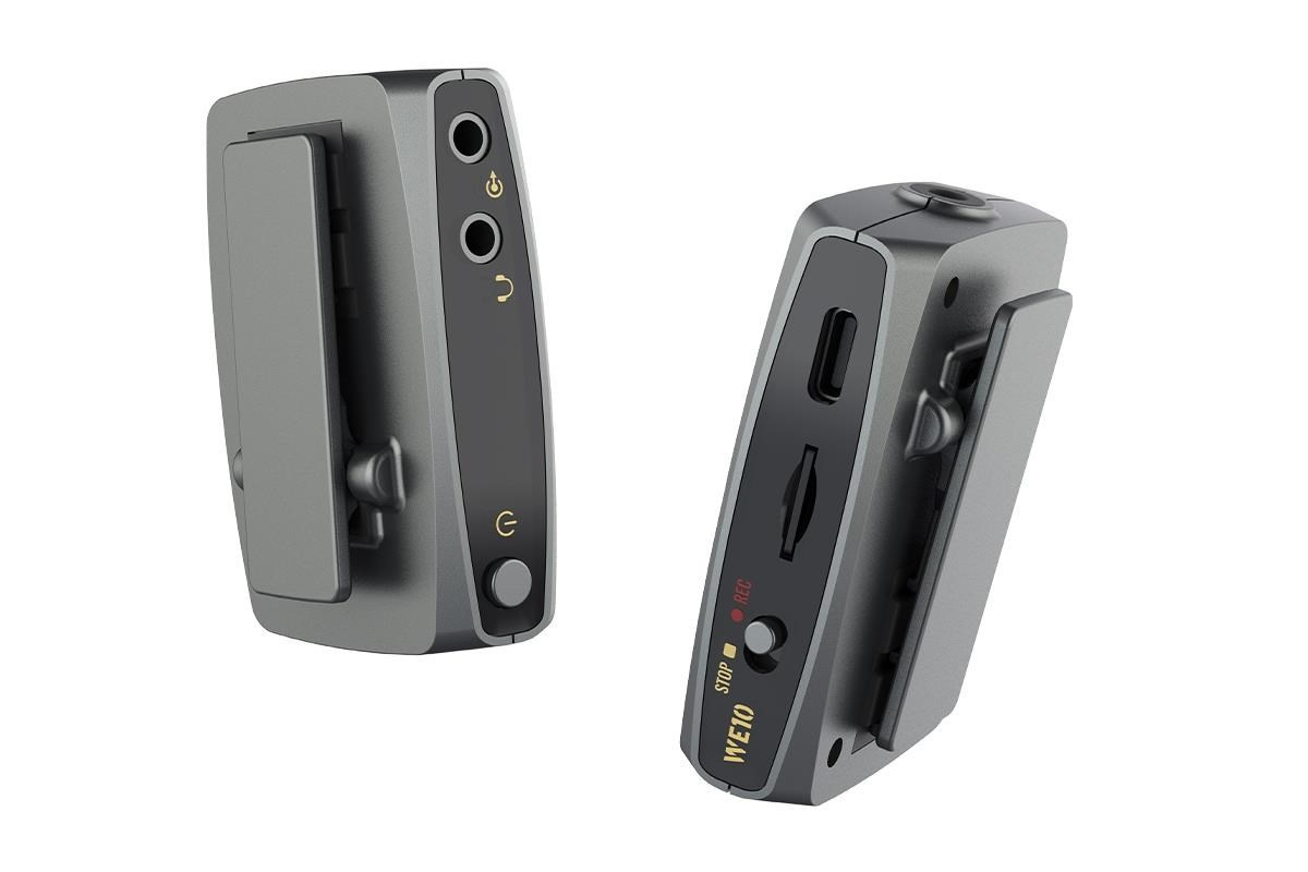 Vysílač v sadě WE10 je vybaven vysoce výkonným všesměrovým mikrofonem. K dispozici je i malý externí klopový mikrofon, který snadno připojíte k vysílači pomocí 3,5 mm jack konektoru a nabízí tak větší volnost při nahrávání. Na zadní straně vysílače je svorka, díky které jej můžete snadno připnout třeba na klopu, kapsu kalhot nebo opasek. Přijímač jednoduše upevníte na horní část fotoaparátu do kolébky blesku nebo připojíte na jiné zvolené záznamové zařízení (kamera, počítač, audio rekordér atd.). Vybrané zařízení propojíte pomocí 3,5 mm jack konektoru a přiloženého audio kabelu.