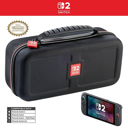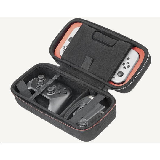 Toto větší přepravní pouzdro od společnosti Nacon oceníte, pokud budete chtít bezpečně a pohodlně přenášet svoji herní konzoli Nintendo Switch 2 včetně jejího základního příslušenství. Pouzdro pojme nejen samotnou konzoli, ale podle potřeby i dokovací stanici, nový ovladač Pro Controller nebo držák Joy-Con 2 Charging Grip. Zároveň nabízí také samostatnou přihrádku pro napájecí adaptér s kabelem a propojovací HDMI kabel. Nastavitelný stojánek v horní části pouzdra, při hraní umožňující pohodlněji sledovat dění na obrazovce, ochrání během přepravy jak obrazovku, tak i analogové páčky konzole a na jeho vnitřní straně navíc naleznete dvanáct kapsiček pro uložení herních karet. Součástí balení jsou pak také dvě menší plastová pouzdra pro microSD karty a čisticí hadřík s logem Nintendo Switch 2. Pouzdro je kompatibilní rovněž s konzolemi Switch a Switch – OLED Model, včetně jejich příslušenství.