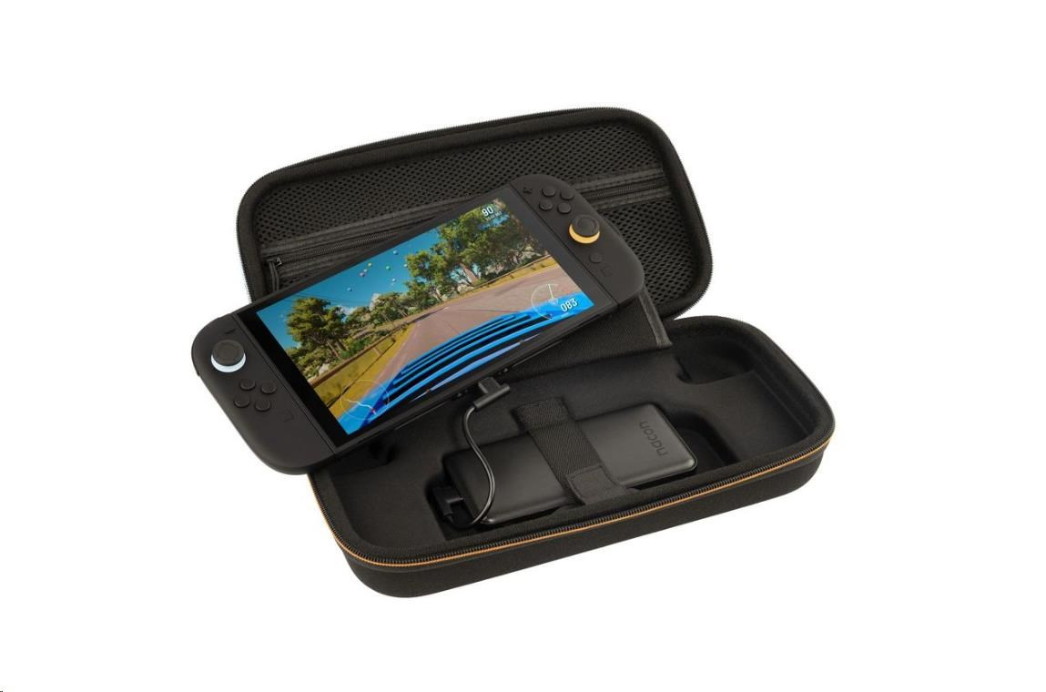 S tímto nabíjecím pouzdrem od společnosti Nacon, obsahujícím powerbanku o kapacitě 10 000 mAh, se už na cestách nebudete muset obávat toho, že se vám baterie v herní konzoli Nintendo Switch 2 vybije dřív, než dorazíte do cíle a budete moct znovu připojit konzoli k nabíječce. Powerbanka, podporující s pomocí přiloženého USB kabelu funkci rychlého nabíjení, vám umožní nabít až 1,5x baterii konzole, kdykoliv to bude zapotřebí – a dokonce při tom budete moct dál nerušeně pokračovat v hraní. Přepravní pouzdro uzavíratelné na zip je zároveň dostatečně pevné, aby v případě nárazu ochránilo před poškozením vaši konzoli i powerbanku, které se v něm navíc díky měkkému vnitřku budou cítit jako v bavlnce. Pouzdro dále obsahuje přepážku chránící obrazovku konzole před poškrábáním s kapsičkami pro deset herních karet a také síťovanou kapsu na zip pro uložení základního příslušenství. Pouzdro je rovněž kompatibilní s konzolemi Switch, Switch Lite a Switch – OLED Model.
