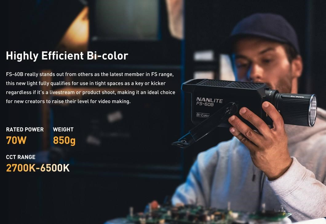Model FS-60B je studiové světlo pro začátečníky, kteří chtějí něčeho dosáhnout jak ve fotografování, tak v natáčení videí – je to kompaktní dvoubarevné LED světlo, které za dané peníze nabízí vysokou hodnotu.