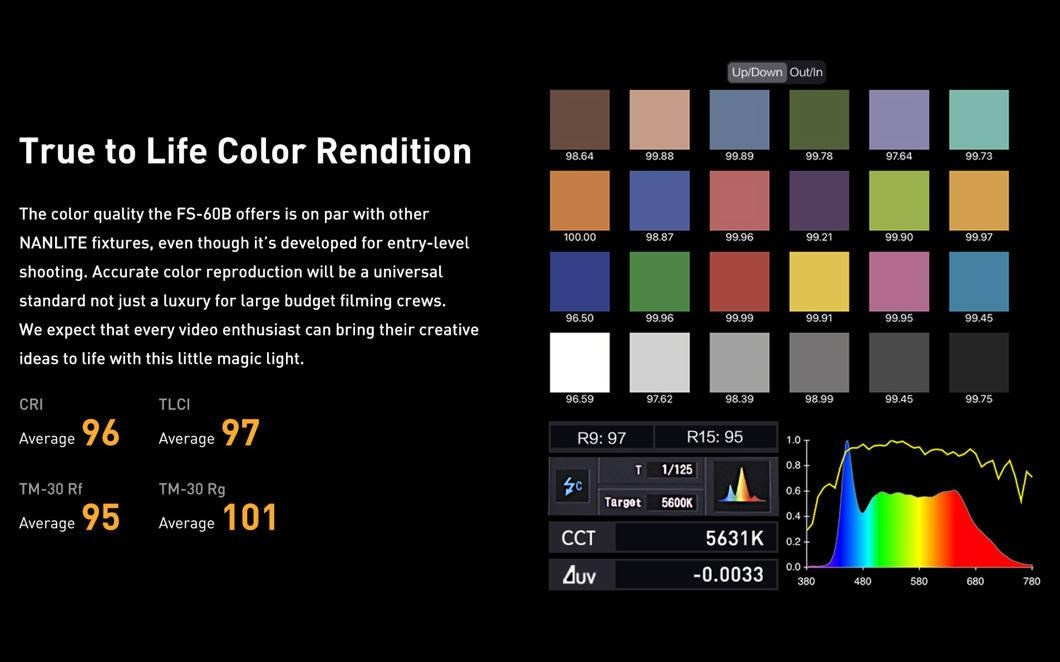 - Přesný a velmi barevný výkon podobný pokročilým světlům Nanlite