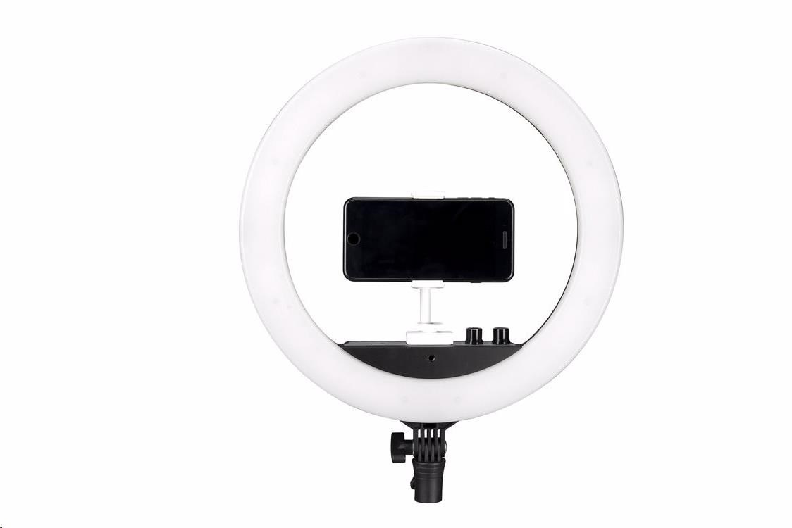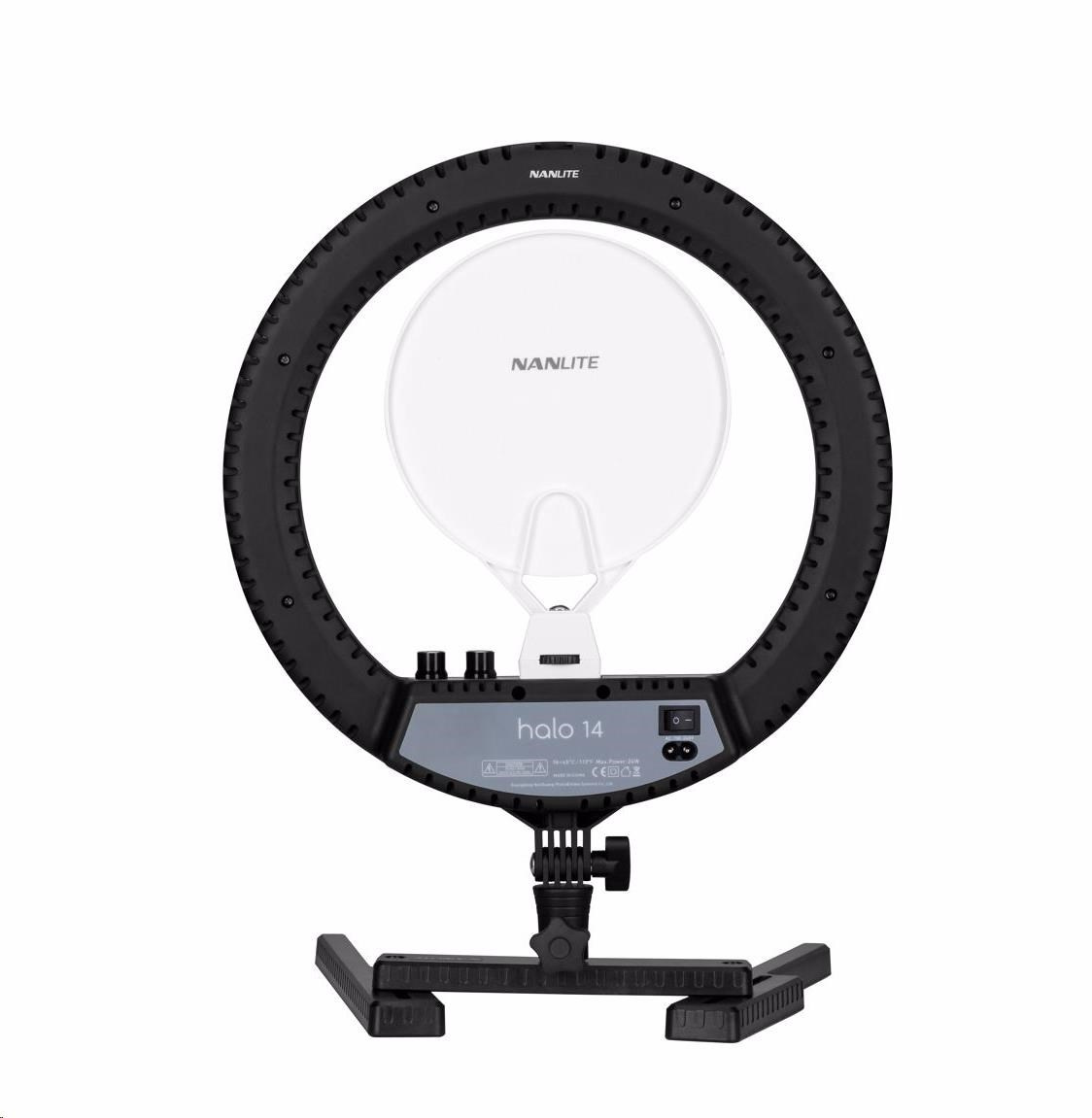 Stmívatelné dvoubarevné LED kruhové světlo Nanlite Halo 14 s napájením pomocí AC adaptéru. Součástí balení je také držák na telefon, make-up zrcátko, přepravní pouzdro a světelný stativ.