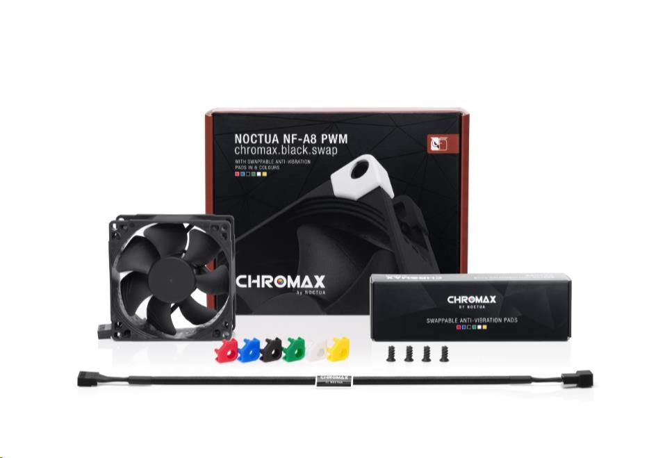 Řada NF-A8 se zasloužila o přední volbu při výběru 80mm větráčků množstvím ocenění a doporučení od technických časopisů a stránek po celém světě. NF-A8 PWM chromax.black.swap kombinuje tichý chod této řady a elegantní celočerný design řady chromax.black. Balení obsahuje také sadu protivibračních podložek pro ty, kteří si rádi svůj stroj barevně sladí. Kvalitu chodu a spokojenost také zaručí SSO2 ložisko, více než 150000 hodin MTTF a 6 let záruky u výrobce.