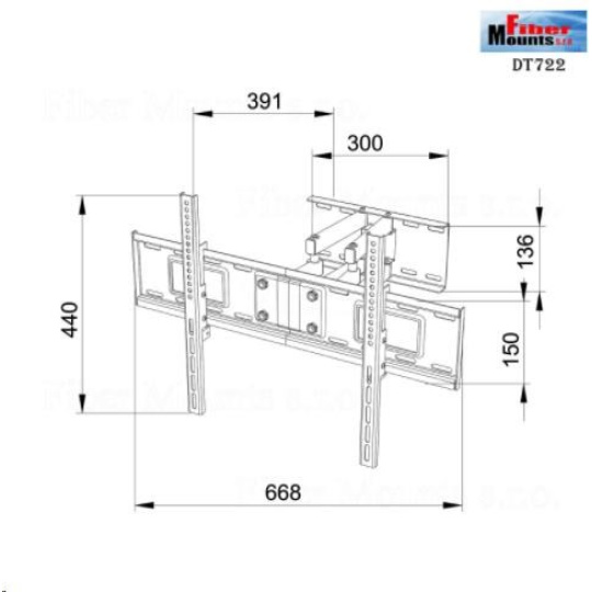 Technické údaje: maximální zatížení 45kg podporuje VESA standardy 75x75 až 600x400 doporučujeme na televizory s úhlopříčkou 37 až 70" vhodný na všechny typy a značky televizorů s podporou VESA nastavitelná vzdálenost od stěny minimální vzdálenost 70mm maximální vzdálenost 460mm otáčení do stran +/- 75° náklon nahoru nebo dole +10° až -20° možná úprava roviny obrazovky po montáži velmi pevná a robustní konstrukce bezpečné uchycení televizoru, zajištění proti vysazení materiál ocel instalační materiál barevné provedení černé záruka 3 roky Otočný držák LCD Fiber Mounts DT723 podporuje uchycení Tv standardy VESA: VESA 75x75 VESA 100x100 VESA 200x100 a 100x200 VESA 200x200 VESA 300x100 a 100x300 VESA 300x200 a 200x300 VESA 300x300 VESA 400x100 a 100x400 VESA 400x200 a 200x400 VESA 400x300 a 300x400 VESA 400x400 VESA 600x400.