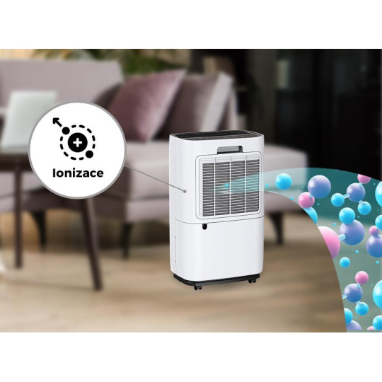 Ionizace v odvlhčovači Dehum 1 má několik důležitých funkcí, které přispívají ke zlepšení kvality vzduchu v místnosti. Ionizace k tomuto procesu přispívá tím, že záporně nabité ionty interagují s molekulami vody ve vzduchu a způsobují, že se kapky vody srážejí do větších částic. Odvlhčovač vzduchu s ionizací tak zlepšuje nejen vlhkost vzduchu, ale také jeho čistotu a může mít pozitivní vliv na prostředí v místnosti a pohodu lidí.