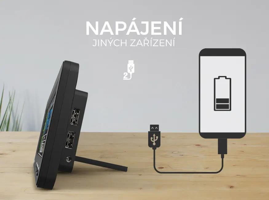 Na boku meteostanice se nacházejí i dva výstupní USB konektory, které můžete použít jako napájení pro další vaše zařízení - například. nabíjení chytrého telefonu nebo napájení USB noční lampy.