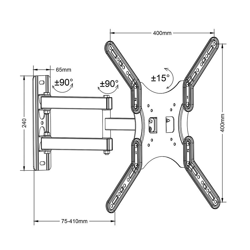 Otočný držák na televize Fiber Mounts M7C59 Ocelový držák na televizi nebo monitor 15-55", otočný do stran +/-90°, naklápění +/-15°, nastavitelná vzdálenost od zdi 75-410mm, VESA 75x75 až 400x400, nosnost 30kg, instalační materiál Kvalitní nástěnný držák pro zavěšení televizorů nebo monitorů s úhlopříčkou 15" až 55". Obrazovkou je možné po instalaci na držák otáčet na obě strany až o +/-90°, naklápět ji nahoru nebo dolů až o +/-15° a kdykoliv měnit vzdálenost od zdi od 75mm až do 410mm. Držák je vhodný i pro zavěšení televize nebo monitoru do rohů místností, na pilíře nebo sloupky, do připravených výklenků apod. Podporuje VESA standardy od 75x75 do 400x400 a unese zatížení 30kg. V balení naleznete instalační materiál. Barevné provedení černé, záruka 5 let. Otočný a sklopný držák na televize a monitory Fiber Mounts M7C59 Technické údaje: nosnost 30kg podporuje VESA standardy 75x75 až 400x400 na televize nebo monitory s úhlopříčkou 15" až 55" otáčení do stran až +/- 90° naklápění až +/- 15° nastavení vzdálenosti od zdi 75mm až 410mm instalační plocha 240 x 65mm kvalitní ocelová konstrukce balení obsahuje instalační materiál barevné provedení černé záruka 5 let Nástěnný držák na Tv monitor Fiber Mounts M7C59 vyniká svou kvalitní ocelovou konstrukcí Držák na Tv a monitory Fiber Mounts M7C59 podporuje VESA standardy: VESA 75x75 VESA 100x100 VESA 200x100 VESA 200x200 VESA 300x300 VESA 400x200 VESA 400x400 Na držáky M7C59 můžete zavěsit libovolné televizory a monitory, které podporují kterýkoliv z výše uvedených VESA standardů a jejichž hmotnost není vyšší jak 30kg..