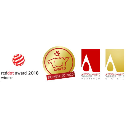 - Certifikovaný produkt s oceněním za design – Red Dot Design Award, Toy Award, A´DESIGN