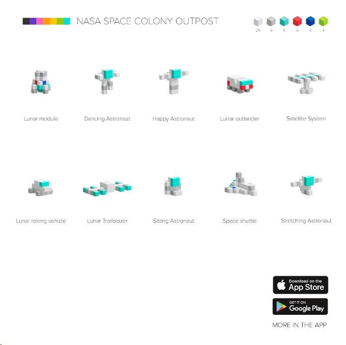 Stavebnice PIXIO 31102 NASA Space Colony Outpost (Koloniální základna) obsahuje 60 bloků PIXIO v 5 barvách. Umožní oživit vaše kreativní nápady a přinesou barevnou radost do života. Začněte tavbou jednoduchých modelů podle pokynů a poté, až budete připraveni, přejděte k vytváření vlastních návrhů. S touto sadou postavíte astronauty, raketoplán, lunární modul, lunární vozidlo, satelitní systém, rover a mnoho dalších. Pixio je splněný sen pro fanoušky Pixel Art, hráče Minecraftu a všechny, kdo si prostě rádi hrají. Použijte jej jako učební zdroj pro rozvoj kreativity dětí. Obsahuje 5 barev, které vám pomohou přeměnit jednoduché tvary na skvělé objekty a postavy (bílá 29x, šedá 9x, světle modrá 8x, červená 6x, modrá 4x, světle zelená 1x).