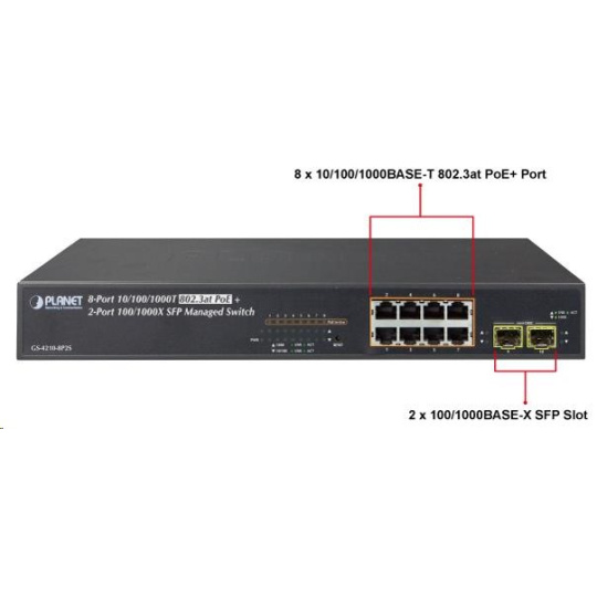 Planet GS-4210-8P2S PoE+ switch 8x 10/100/1000Base-T, 2x SFP, 802.3at do 120W, VLAN, SNMP/WEB