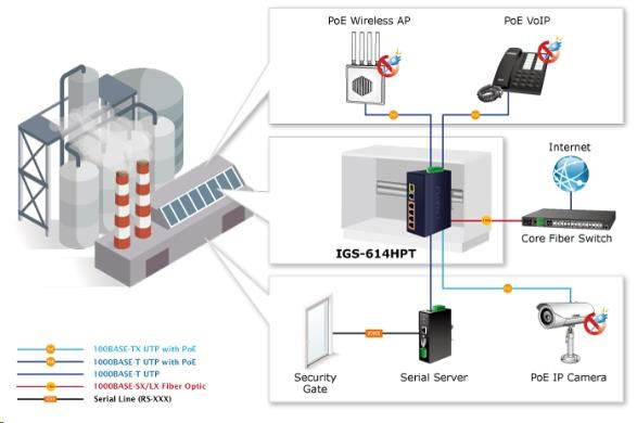 Planet IGS-614HPT, PoE switch, 5x 1000Base-T, 1x SFP, 4x PoE 802.3at, -40~+75°C, 12-56VDC, dual-power, DIN