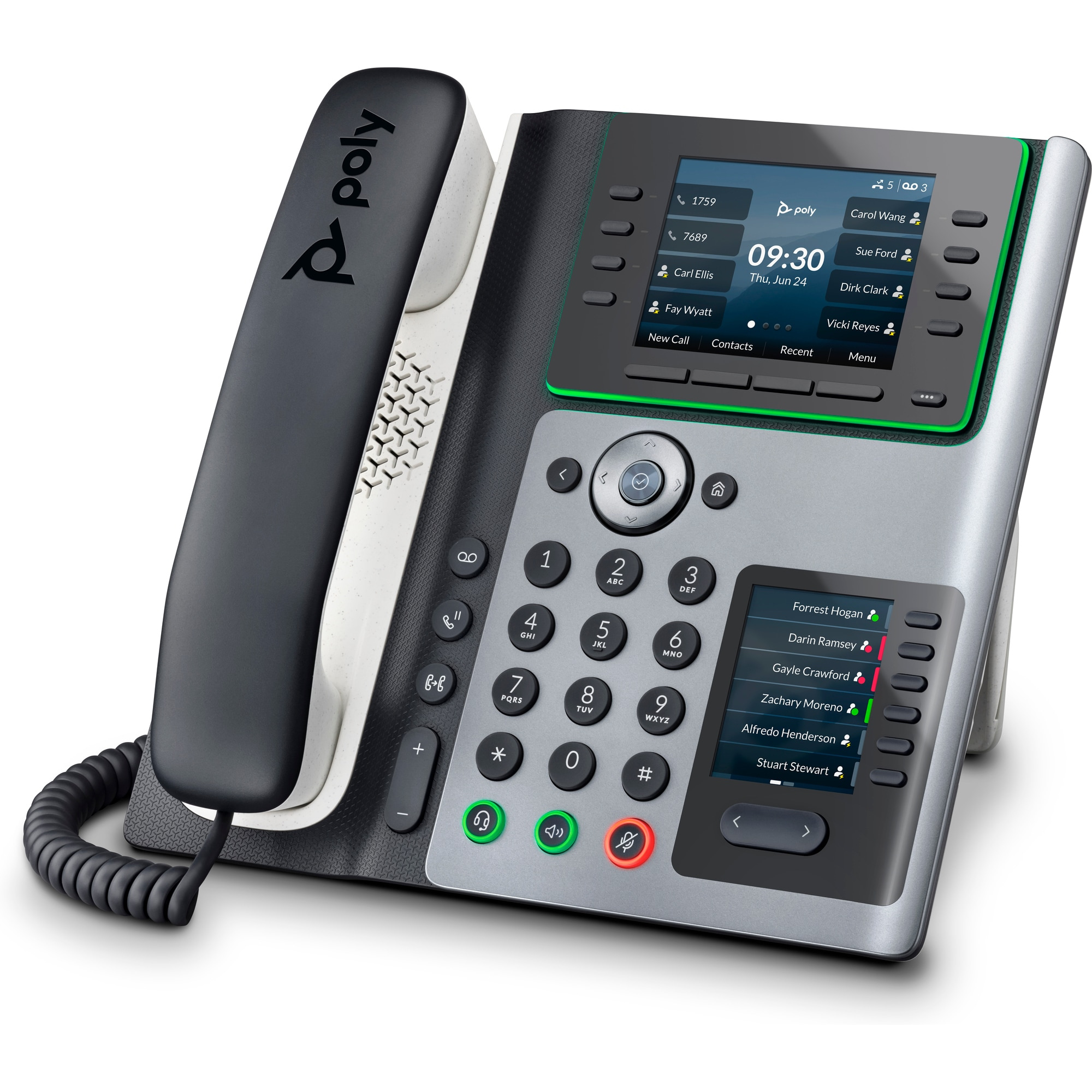 | Audio | Poly HD Voice; Technologie Poly Acoustic Clarity zajišťuje plně duplexní hovory a potlačuje akustickou ozvěnu i okolní šum; Technologie Poly Acoustic Fence potlačuje okolní hluk při použití sluchátka nebo kabelové náhlavní soupravy; Technologie Poly NoiseBlockAI odstraňuje většinu okolního hluku při používání konferenčního reproduktoru; Aplikace Poly Computer Audio Connector nainstalovaná v počítači (pouze Windows) umožňuje vybrat telefon pro zvukový vstup a výstup počítače a použít s počítačovými aplikacemi sluchátka, volitelné náhlavní soupravy a handsfree hlasitého odposlechu; Design s vylepšenými basy; Širokopásmový zvuk TIA-920, v souladu s typem 1 (plně duplexní IEEE 1329); Individuální nastavení hlasitosti s vizuální zpětnou vazbou pro každou zvukovou cestu; Detekce hlasové aktivity; Komfortní tvorba hluku; Generování tónů DTMF (RFC 2833 a v pásmu); Přenos zvukových paketů s nízkým zpožděním; Adaptivní paměti pro vyrovnání zpoždění |
