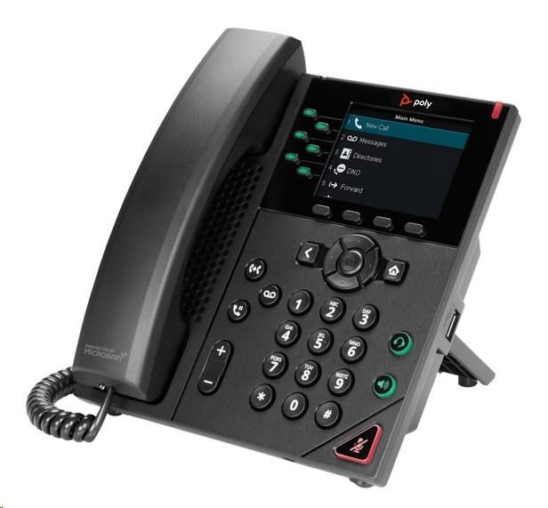 Audio | Poly HD Voice; Technologie Poly Acoustic Clarity zajišťuje plně duplexní hovory a potlačuje akustickou ozvěnu i okolní šum; Technologie Poly Acoustic Fence potlačuje okolní hluk při použití sluchátka nebo kabelové náhlavní soupravy; Aplikace Poly Computer Audio Connector nainstalovaná v počítači (pouze Windows) umožňuje vybrat telefon pro zvukový vstup a výstup počítače a použít s počítačovými aplikacemi sluchátko, volitelnou náhlavní soupravu a handsfree hlasitý odposlech; Individuální nastavení hlasitosti s vizuální zpětnou vazbou pro každou zvukovou cestu; Detekce hlasové aktivity; Komfortní tvorba hluku; Generování tónů DTMF (RFC 2833 a v pásmu); Přenos zvukových paketů s nízkým zpožděním; Adaptivní paměti pro vyrovnání zpoždění |