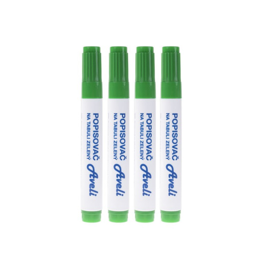 Popisovače na tabule a flipcharty AVELI. Sada 4 zelených popisovačů. Netoxický Šíře stopy 3 mm Kuželový hrot Snadno stíratelný Odolný proti vyschnutí.