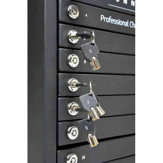 Originální napájecí skřínka s funkcí dobíjení a individuálních zámků pro každé zařízení zvlášt.
