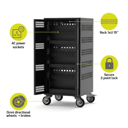 - Kapacita: až 30 notebooků do velikosti 15,6 '' a 1x RACK U19"