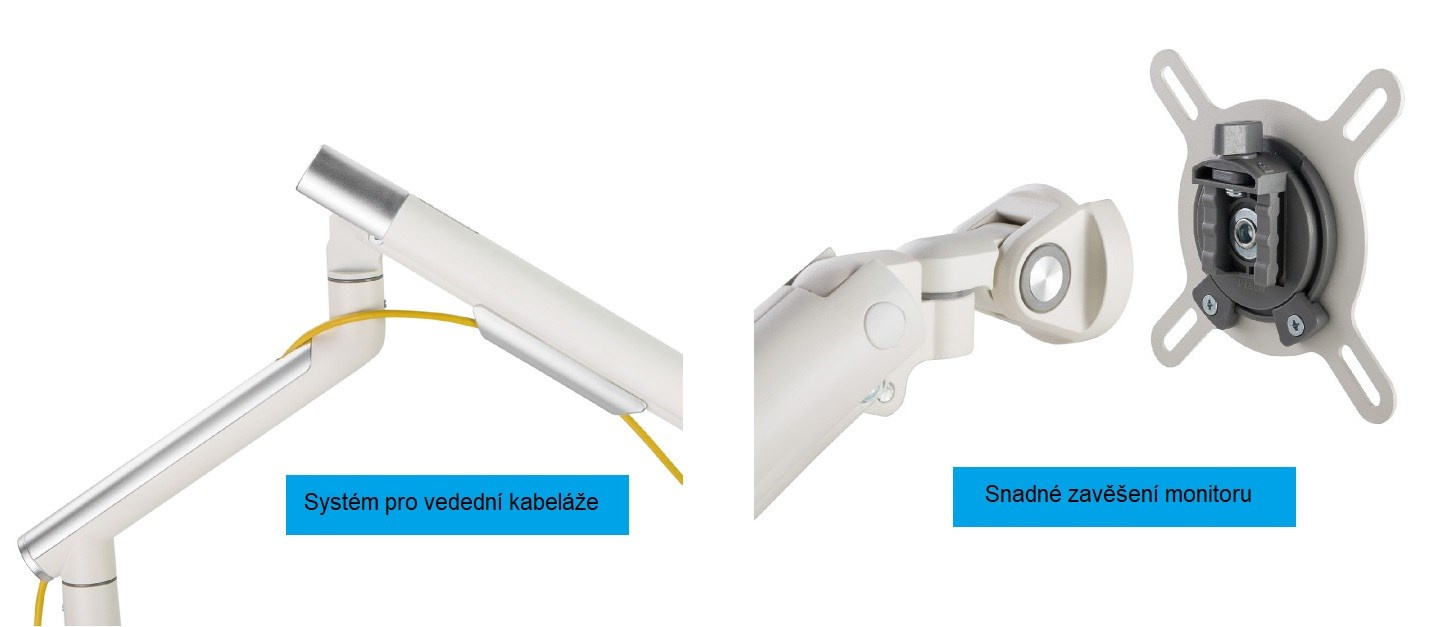 Prémiový stolní držák na monitor Fiber Mounts M4C37 Ergonomický polohovatelný držák na monitory 17-32", VESA 75x75 a 100x100, nastavení vzdálenosti monitoru od stolního uchycení, nastavení výšky, otáčení do stran, naklápění, funkce pivot, plynová pružina, nosnost 9kg, 2 stolové úchyty, vedení kabeláže, barva bílá Kancelářský držák prémiové kvality a krásného designového zpracování v bílé barvě se stříbrnými kryty. Držák poskytuje nejvyšší ergonomii - komplexní nastavitelnost: výškové polohování, nastavení vzdálenosti od stolního uchycení, otáčení do stran, naklápění, funkce pivot pro otočení obrazovky na šířku nebo na výšku. Balení obsahuje 2 typy uchycení na stolové desky: na okraje stolů nebo přes průchodku (1x otvor min. 10mm) kdekoli v prostoru stolu. Polohování je velmi snadné a rychlé, pozici monitoru můžete měnit dle potřeby x krát denně. Doporučujeme i velmi náročným zákazníkům nebo do kanceláří, kde chtějí poskytnout zaměstnancům skvělou ergonomii a pohodlí při práci, to vše navíc v krásném designovém provedení. Ergonomický držák monitoru v prémiové kvalitě Fiber Mounts M4C37 Technické údaje: nosnost 9kg plynová pružina s nastavením dle hmotnosti monitoru doporučená úhlopříčka monitoru 17-32" podpora VESA standardů 75x75 a 100x100 výškové polohování 260mm minimální výška 175mm, maximální výška 435mm vzdálenost monitoru od stolního uchycení 0-549mm funkce pivot pro nastavení monitoru na šířku nebo na výšku uchycení na stolové desky o průměru 10-80mm 2 typy úchytů na stoly: svěrák na okraj stolu a šroubovice na průchodku (otvor min. 10mm) systém pro vedení kabeláže barevné provedení bílé, krytky stříbrné záruka 5 let Prémiový designový držák na monitory ergonomický do kanceláří Fiber Mounts M4C37 Držák M4C37 podporuje VESA standardy: VESA 75x75 VESA 100x100 možnost zakoupit včetně rozšíření na VESA 200x100 a 100x200 možnost zakoupit včetně rozšíření na VESA 200x200.