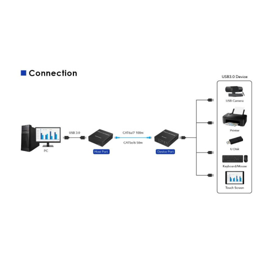 Tento extender překračuje omezení maximální vzdálenosti USB kabelu a umožňuje zapojit všechny USB periferie do vzdálenosti až 100m za pomoci kabelu Cat5e/Cat6/Cat6A.