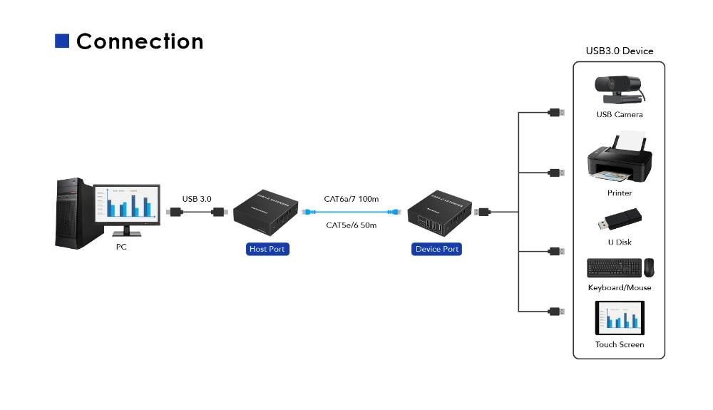 Tento extender překračuje omezení maximální vzdálenosti USB kabelu a umožňuje zapojit všechny USB periferie do vzdálenosti až 100m za pomoci kabelu Cat5e/Cat6/Cat6A.