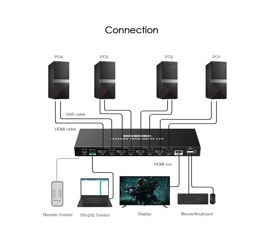 KVM přepínač umožňuje zapojit až 4 servery nebo PC a ovládat jednoduše pomocí HDMI monitoru a USB klávesnice a myši.