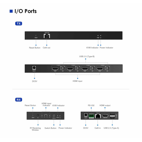 - KVM přepínač (transmitter) se propojí kvalitním kabelem Cat6/7 na vzdálenost až 70m s receiverem