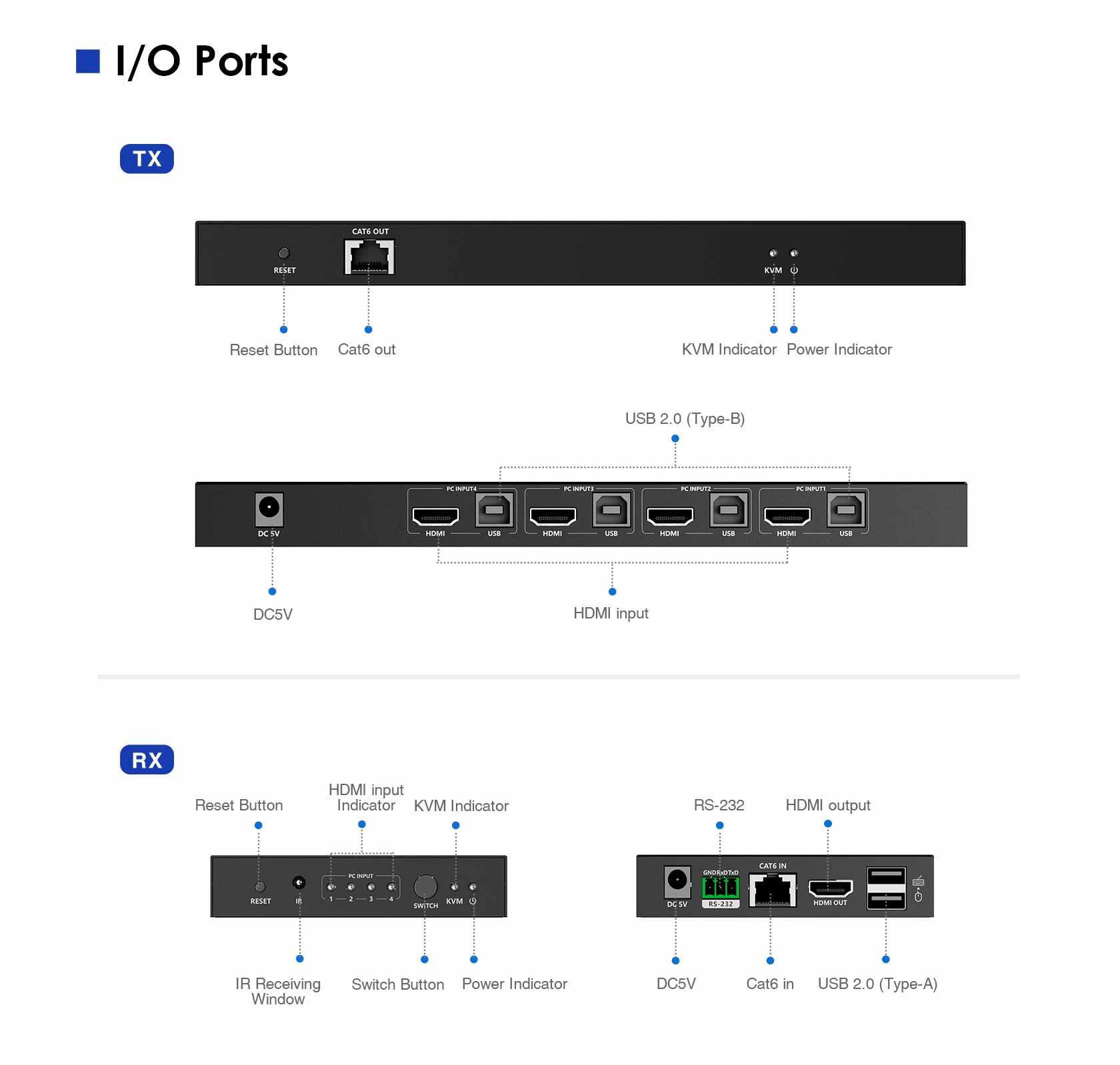 - Komplet se sestává z KVM přepínače (transmitter) a receiveru