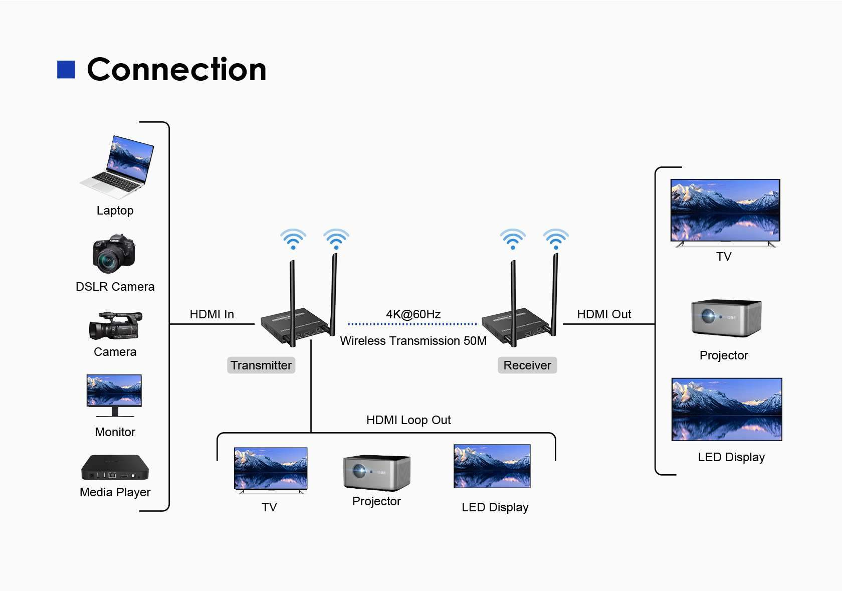 - Poporuje bezdrátový přenos rozlišení 4K@60Hz a Full HD 1080p na vzdálenost až 50m