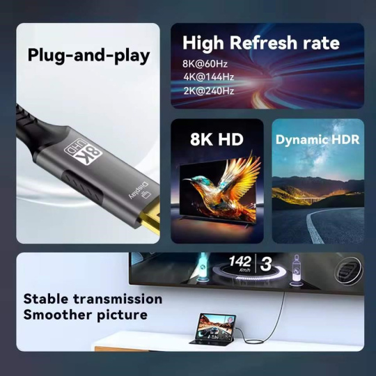 Kabel s nejnovější specifikací DP1.4 přichází, podporuje rozlišení až 8K@60 Hz s HDCP 2.2, umožňuje připojit a zobrazovat na nejnovějších monitorech nebo televizorech v rozlišení ultra HD 8K@60Hz