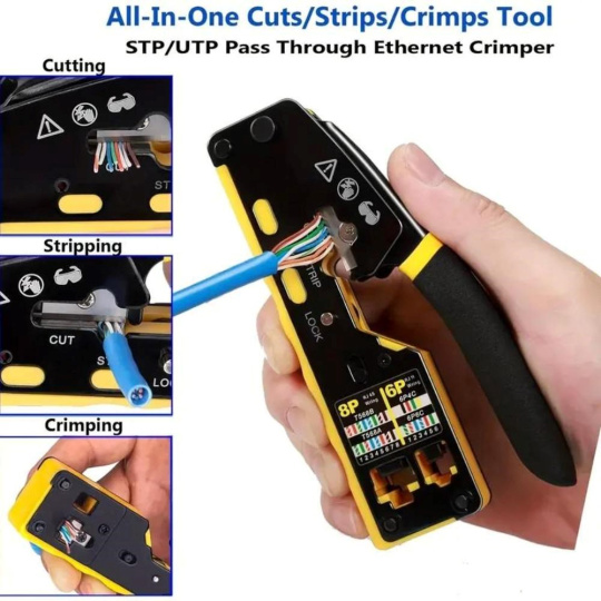 PremiumCord krimpovací kleště na průchozí RJ konektory jsou spolehlivým univerzálním nástrojem pro práci s většinou běžných modulárních zástrček řady RJ — včetně RJ11, RJ12, RJ14, RJ45 a dalších typů. Díky konstrukci 3 v 1 umožňují snadné krimpování, stříhání i odizolování kabelů, což výrazně urychluje a zpřesňuje práci při výrobě či opravách síťových a telefonních vedení.