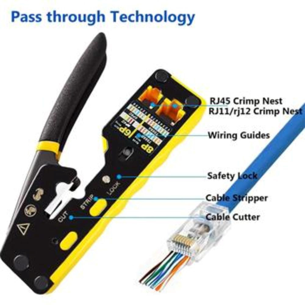 PremiumCord krimpovací kleště na průchozí RJ konektory jsou spolehlivým univerzálním nástrojem pro práci s většinou běžných modulárních zástrček řady RJ — včetně RJ11, RJ12, RJ14, RJ45 a dalších typů. Díky konstrukci 3 v 1 umožňují snadné krimpování, stříhání i odizolování kabelů, což výrazně urychluje a zpřesňuje práci při výrobě či opravách síťových a telefonních vedení.