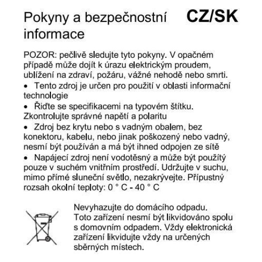- výstupní konektor: vnější průměr konektoru: 5,5mm, vnitřní průměr konektoru: 2,1mm