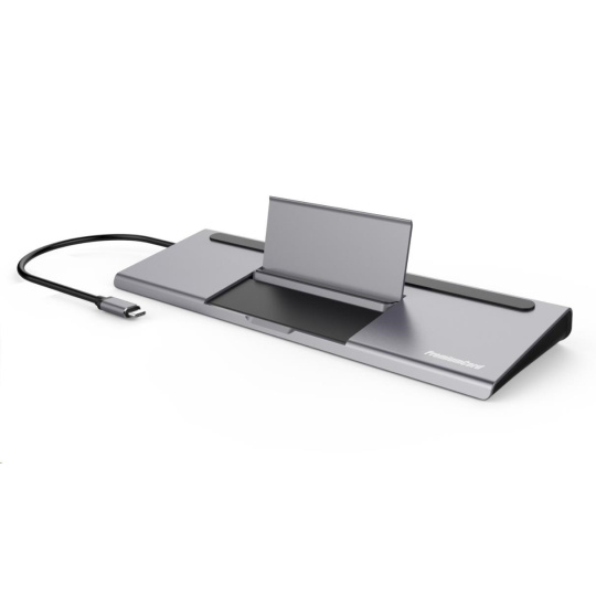 Dokovací stanice může sloužit jako podložka pod notebook, obsahuje čtečku SD karet, konektor RJ45 na připojení na počítačovou síť, 2x USB3.0 + 1x USB2.0, PD konektor 100W konektory a výstup audio na sluchátka nebo do reproduktorů.