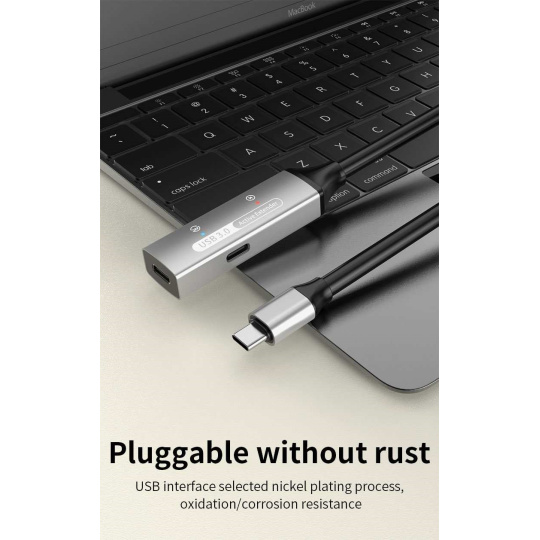 - Napájení s USB sběrnice. Kabel má přídavný USB-C napájecí konektor pro případ, že vzdálené připojené zařízení potřebuje větší příkon, v tom případě lze do prodlužovacího kabelu připojit z boku USB-C přídavný napájecí adaptér.
