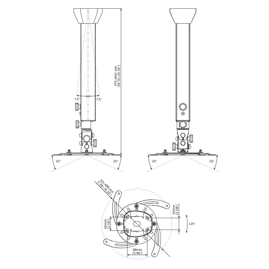 Profesionální designový stropní držák na projektor EDBAK PMV100 Stropní držák pro zavěšení projektoru s hmotností do 15kg, nejvyšší kvalita, design, nastavitelnost 45-65cm Ne vždy je možné použít obyčejný stropní držák na projektory, někdy je nutné použít držáky nejvyšší kvality a krásného designu. My Vám takové držáky na projektory nabízíme. Ucelená řada profesionálních stropních držáků na projektory v nadherném designovém provedení. Držáky jsou plně nastavitelné, vhodné pro 99% dostupných projektorů a dataprojektorů. Barevné provedení černé nebo bílé. Záruka 5 let. Pokud Vám záleží na designu stejně jako na kvalitě, jste na správné stránce. Profesionální délkově nastavitelný otočný a sklopný stropní držák na projektory Edbak PMV100 Technické údaje: nosnost 15kg univerzální držák pro uchycení 99% dostupných projektorů na projektory se 3 nebo 4 otvory pro uchycení rozteč otvorů pro uchycení v rozmezí 50-490mm délkové nastavení 450mm až 650mm otáčení do stran +/- 360° náklon do stran +/- 25° náklon nahoru a dole +/- 25° korekce roviny obrazu korekce nerovnosti stropu +/- 7,5° zajištění v požadované pozici systém pro skryté vedení kabeláže nejvyšší kvalita - profesionální provedení nádherný design bílé nebo černé provedení záruka 5 let Stropní a nástěnné držáky na projektory nejvyšší kvality, profesionální Edbak PMV100 Na stropní držák s nastavením délky 45-65cm EDBAK PMV100 je možné uchytit všechny projektory, které mají 3 nebo 4 otvory se závitem s roztečí 50mm až 490mm. Profesionální stropní nebo nástěnné držáky na projektory Edbak PMV100 Díky nejvyšší kvalitě a profesionálnímu provedení jsou držáky EDBAK řady PMV vhodné opravdu kamkoliv..