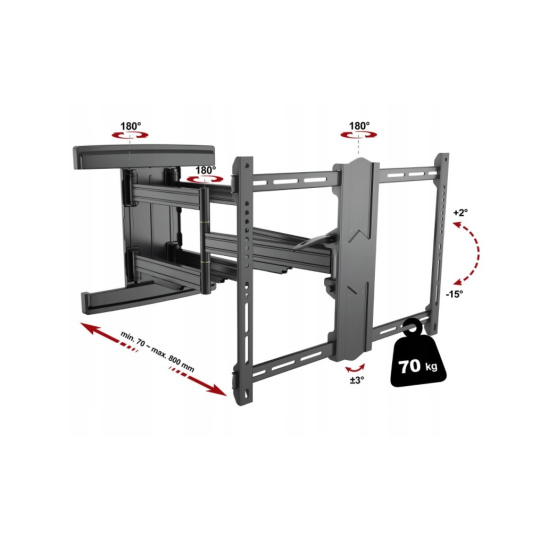 Profesionální držák Tv Fiber Novelty Noston Profesionální nástěnný držák na Tv 43-90", otočný, sklopný, délkové nastavení, korekce roviny, vedení kabeláže, krásný design a špičková kvalita, VESA standardy 200x100 až 600x400, nosnost 70kg Plně nastavitelný držák na všechny typy televizorů s úhlopříčkou 43" až 90", který je v krásném designu a přitom poskytuje opravdu EXTRA pevné a bezpečné zavěšení televizorů s hmotností až 70kg. I při této zátěži můžete každou zavěšenou televizi vysunout od zdi od minimální délky 70mm až po neskutečných 800mm. Tento držák v délkovém nastavení předčí naprostou většinu držáků přitom za zlomek ceny těchto držáků. Televizi můžete otáčet do stran a naklápět. V případě nepřesné instalace má držák systém pro korekci roviny obrazovky. Polohování je snadné a zvládnou to i děti, přitom budete mít vždy jistotu naprosté bezpečnosti i u největších a opravdu těžkých televizorů. Ramena držáku jsou osazena krytkami pro vedení kabeláže. V balení naleznete i montážní materiál. Barevné provedení černé. Záruka 5 let. Profesionální držák na televize v nejvyšší kvalitě a špičkovém provedení Technické údaje: nosnost 70kg podpora VESA standardu 200x100 až 600x400 doporučujeme na Tv s úhlopříčkami 43" až 90" nastavení vzdálenosti od zdi 70-800mm otáčení Tv do stran +/-75° možnost náklonu obrazovky + 2° až - 15° korekce roviny obrazovky + 3° až -3° systém pro vedení kabeláže extrémně pevná a spolehlivá konstrukce nejvyšší bezpečnost velmi pěkný design profesionální polohovatelný držák na televize barevné provedení černé montážní materiál součástí balení záruka 5 let Profesionální otočný sklopný a výsuvný držák na televize Fiber Novelty Noston Televizní držák Fiber Novelty Noston podporuje VESA standardy: VESA 200x100 VESA 200x200 VESA 300x100 a 100x300 VESA 300x200 a 200x300 VESA 300x300 VESA 400x200 a 200x400 VESA 400x300 a 300x400 VESA 400x400 VESA 600x400 Bezpečné a spolehlivé zavěšení všech typů televizorů s úhlopříčkou 43 až 90 palců (94 až 230cm) a to i při maximální zátěži 70kg a maximálním vysunutí obrazovky od zdi na vzdálenost 80cm. Pro zajištění bezpečnosti je nutné opravdu spolehlivé ukotvení držáku do zdi..