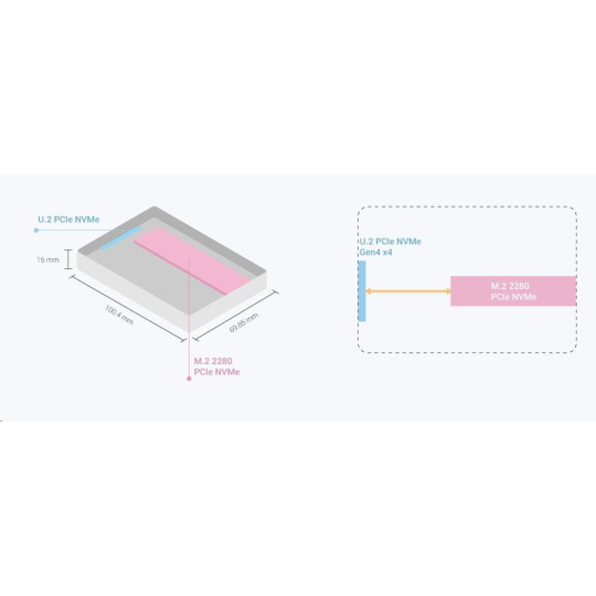 Produkt QDA-UMP4 umožňuje instalovat jeden M.2 PCIe 4.0 x4 NVMe SSD do 2,5” diskové pozice U.2 (SFF-8639) PCIe 4.0 x4 NVMe SSD. Pro zařízení QDA-UMP4 není potřeba žádný další software ani ovladače a lze jej nainstalovat do počítače/pracovní stanice (Windows®, Linux®) nebo QNAP NAS, aby bylo možné používat disky M.2 SSD jako cenově výhodnou alternativu drahých disků U.2 SSD..
