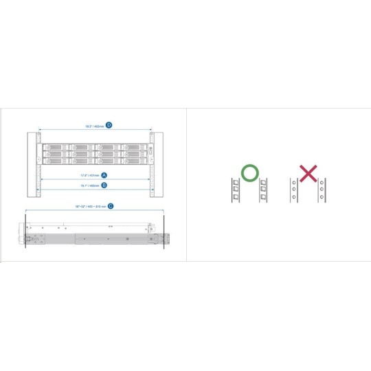 - Vzdálenost mezi dvěma rackovými sloupky (měření čtvercových otvorů racku střed-střed) je 18,3"(465 mm)
