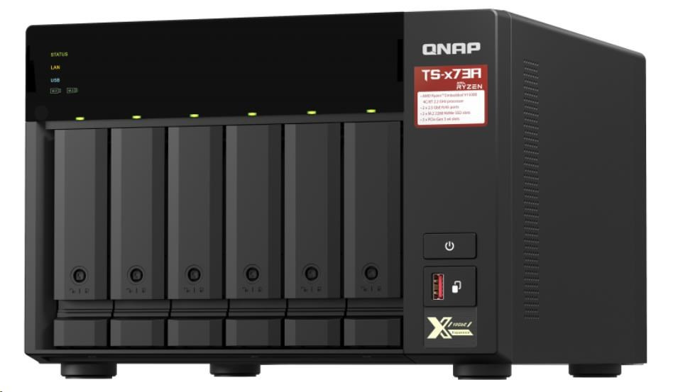 Disponuje čtyřjádrovým procesorem AMD Ryzen™ řady V1000 V1500B, který poskytuje vysoký výkon systému díky až čtyřem jádrům / 8 vláknům a Turbo Core až 2,2 GHz. Zařízení TS-673A disponuje dvěma porty 2,5GbE RJ45 a dva sloty PCIe Gen 3, abyste mohli flexibilně nasazovat sítě 5GbE/10GbE. Dva sloty M.2 NVMe SSD pro technologii Qtier a SSD Cache umožňují neustálou optimalizaci úložiště. Zařízení TS-673A podporuje systémy QTS a QuTS hero, což uživatelům umožňuje flexibilně přepínat operační systém na základě jejich požadavků.