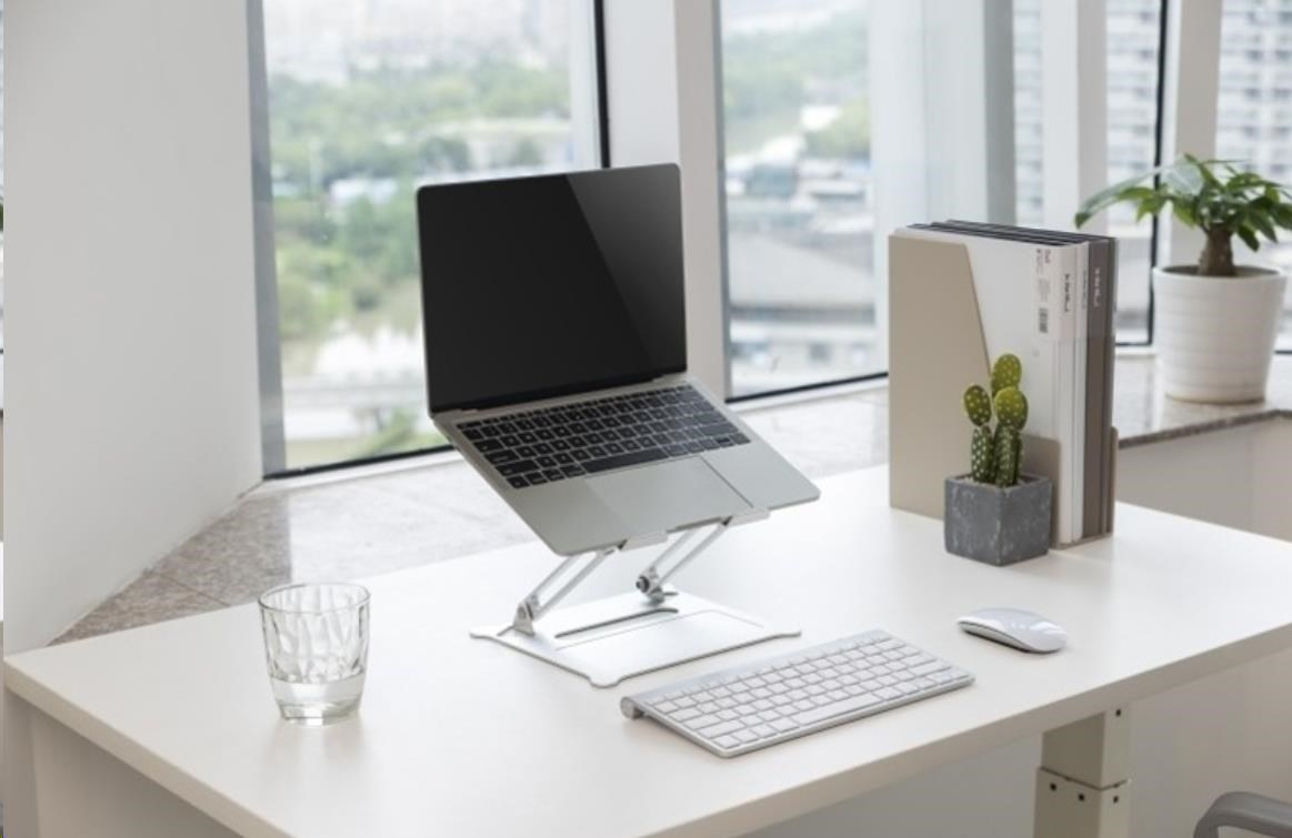 ERGOnomický hliníkový stojan na laptopy nebo tablety max 5kg pro dosažení optimálního nastavení náklonu a výšky 11-15" monitoru, přenosné provedení na stůl s protiskluzovými plochami a otvory pro ventilaci, pro použití externí klávesnice, rozměry 26x23x16 cm, barva stříbrná.