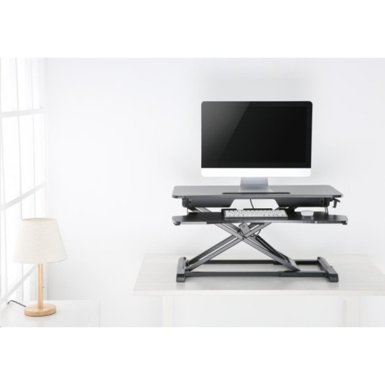 ERGOnomická pracovní plocha na laptop / monitor max 15kg a klávesnici max 2kg s X mechanizmem se vzduchovým pístem pro změnu výšky 10,6-50cm na stole, řešení změny pozice ze sezení na stání bez nutnosti úpravy kabeláže, rozměry 95x61,5x50 cm + plocha 94,5x30cm, barva černá.