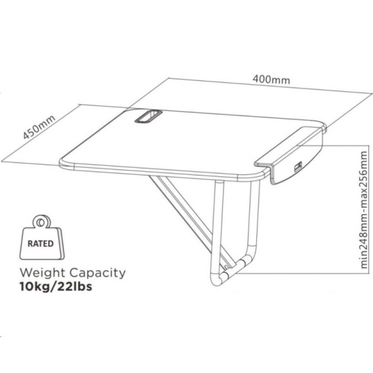 ERGOnomická pracovní plocha na laptop a mobil max 10kg pro uchycení na opěrnou část pracovní židle, jednoduché řešení pro změnu pozice při práci s laptopem ze sezení na stání, nastavení optimálního náklonu opěrným mechanizmem, přenosné provedení, rozměry 45x40x26 cm, barva černá.