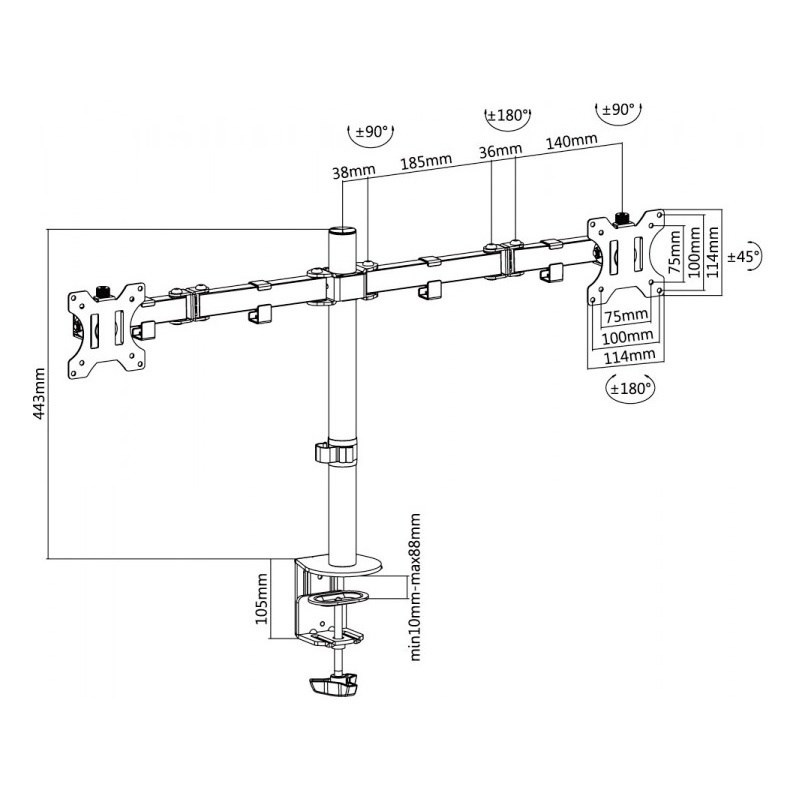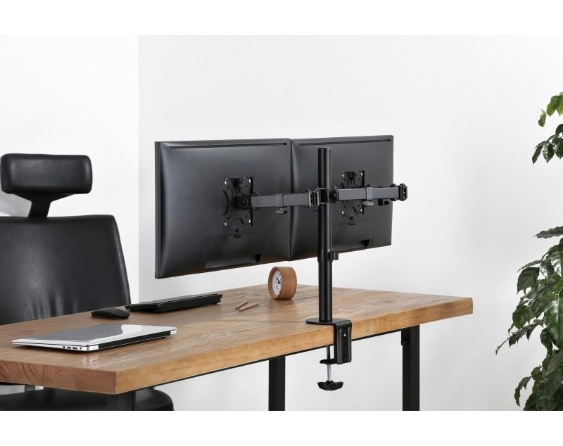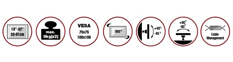 Stolní držák s upevňovací klemou pro 2x LCD monitor s uhlopříčkou 13"- 32" a hmotností maximálně 8kg na rameno. 2x 39,9cm rameno - 3x pant, vertikálně výklopný +45°/-45° a horizontálně +90°/-90°, otočení monitorů o 90°, výška středového sloupku 44,3cm. Uchycení VESA: 75x75, 100x100. Možnost uchycení kabeláže..