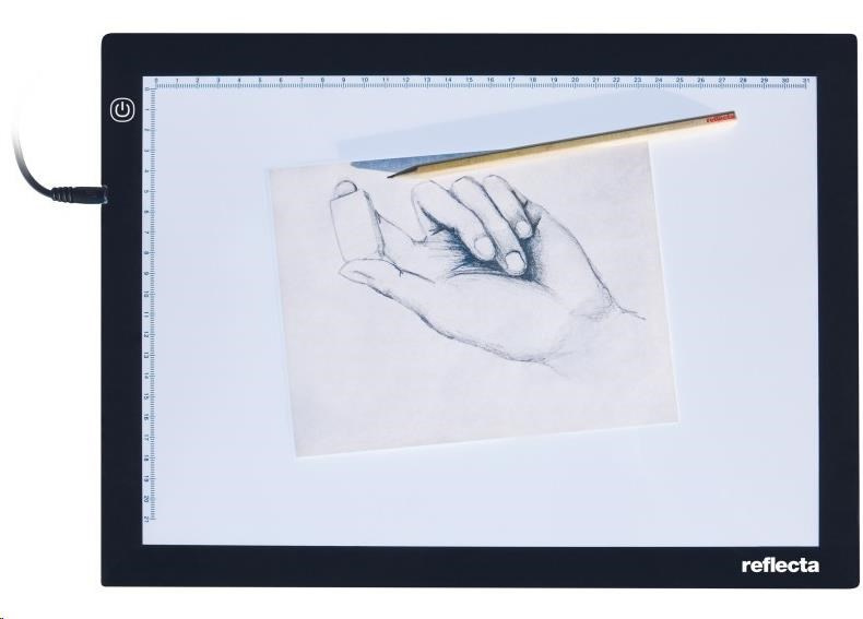 Prosvětlovací panel s moderní SuperSlim LED technologií, prosvětlovací plocha 21x31cm s měřítkem v cm na okraji plochy, plynulá regulace výkonu, dotykové ovládání, síťový zdroj AC/DC 12V/8W - 3,5mm Jack, životnost LED 50.000h. Rozměry 36x27x0,8cm, hmotnost 900g..