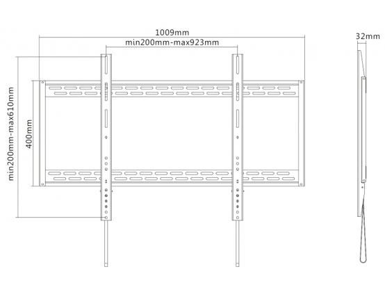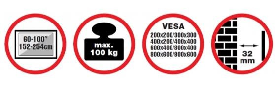 Nástěnný ocelový držák na Plasma a LCD TV s uhlopříčkou 60"- 100" (152-254cm) a hmotností maximálně 100kg. Konzole na zavěšení TV s vodováhou, není vertikálně výklopný, vzdálenost od stěny 32mm, materiál ocel, Click-in system, barva černá. Uchycení VESA: 200x200, 400x200, 300x300, 400x400, 600x400, 800x400, 800x600, 900x600..