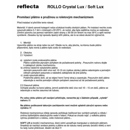Roletové plátno ROLLO CrystalLine 300x226cm, viditelná plocha 290x181cm, 16:10, 135"/342cm, bílý hranatý kovový tubus 9x315cm/16kg, uchycení na stěnu nebo strop, materiál BetaLux - bílá 0,35 tkanina 300g/m2 s 4cm černým okrajem a zadní stranou, Gain=1,0, pozorovací úhel 120°. Lux - bílý matný povrch pro maximálně věrný a kontrastní obraz při alespoň částečném zatemnění. PVC materiál s textilním základem vytváří rovnou plochu bez zvlnění ale v krajích může docházet k prohnutí - postupně mizí. Uchycení 4 vruty na plastových bocích plátna - nutné použit přiložené kovové podložky. Možnost aretace polohy plátna při každé otáčce mechanizmu. Pozor při zpětném navíjení plátna je nutné plátno přidržovat - nesmí dojít k rychlému navinutí, které při nárazu na tubus může poškodit vnitřní mechanizmus bez možnosti uplatnění záruční doby..