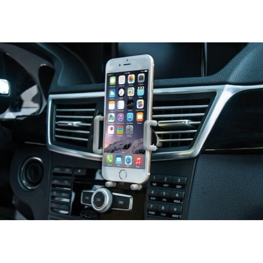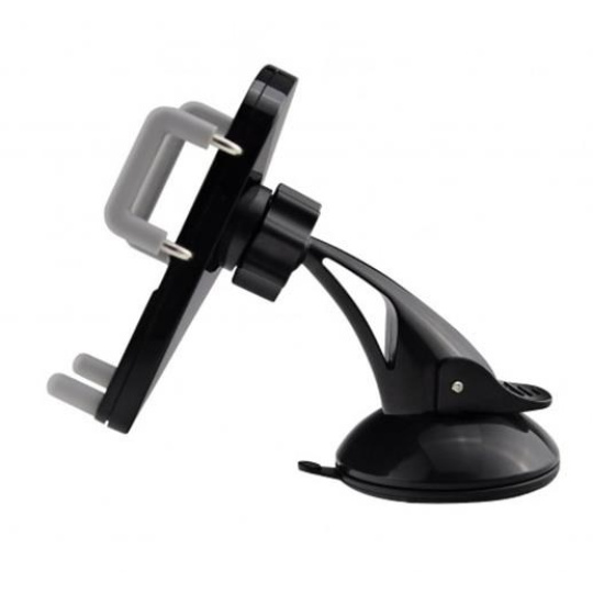 Stojánek pro chytré dotykové telefony 3-6" v horizontální i vertikální poloze do auta. Přísavný adapter na sklo a hladkou palubní desku s kulovou hlavou pro volné nastavení, uchycení do výdechu vzduchtechniky, fixace ze tří stran, plastové provedení, černý..